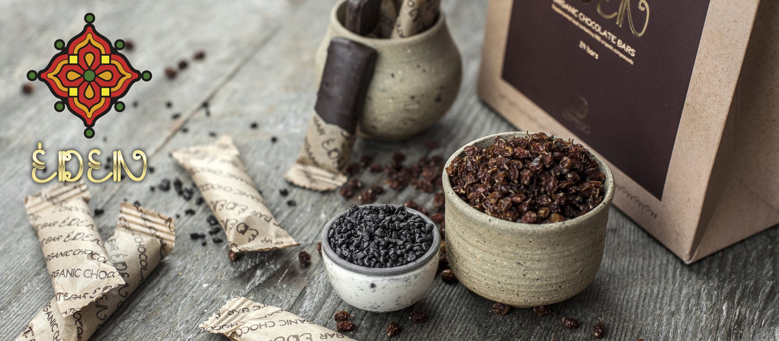 Éden – Organisk chokladbars. En smakupplevelse med bland annat våra växtbaserade mineraler och humus. Finns i förpackning med 7 alternativt 28 bars.